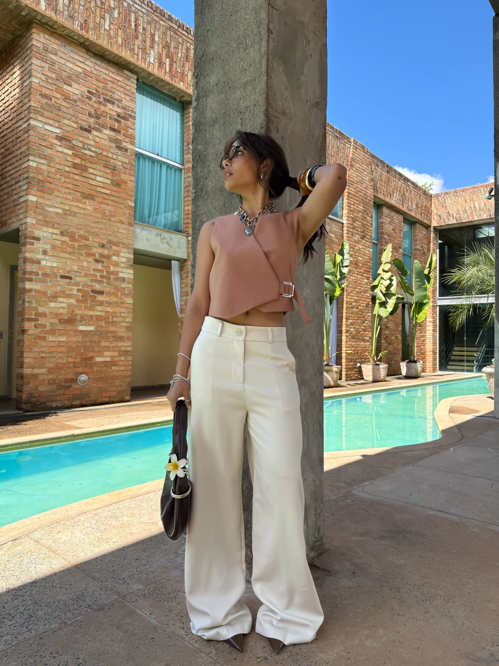 Colete confeccionado em crepe alfaiataria, forrado e com o tecido duplo. Possui decote em "V" transpassado na frente e fechamento por fivela na lateral. Tecido bem estruturado, peça versátil e atemporal.
