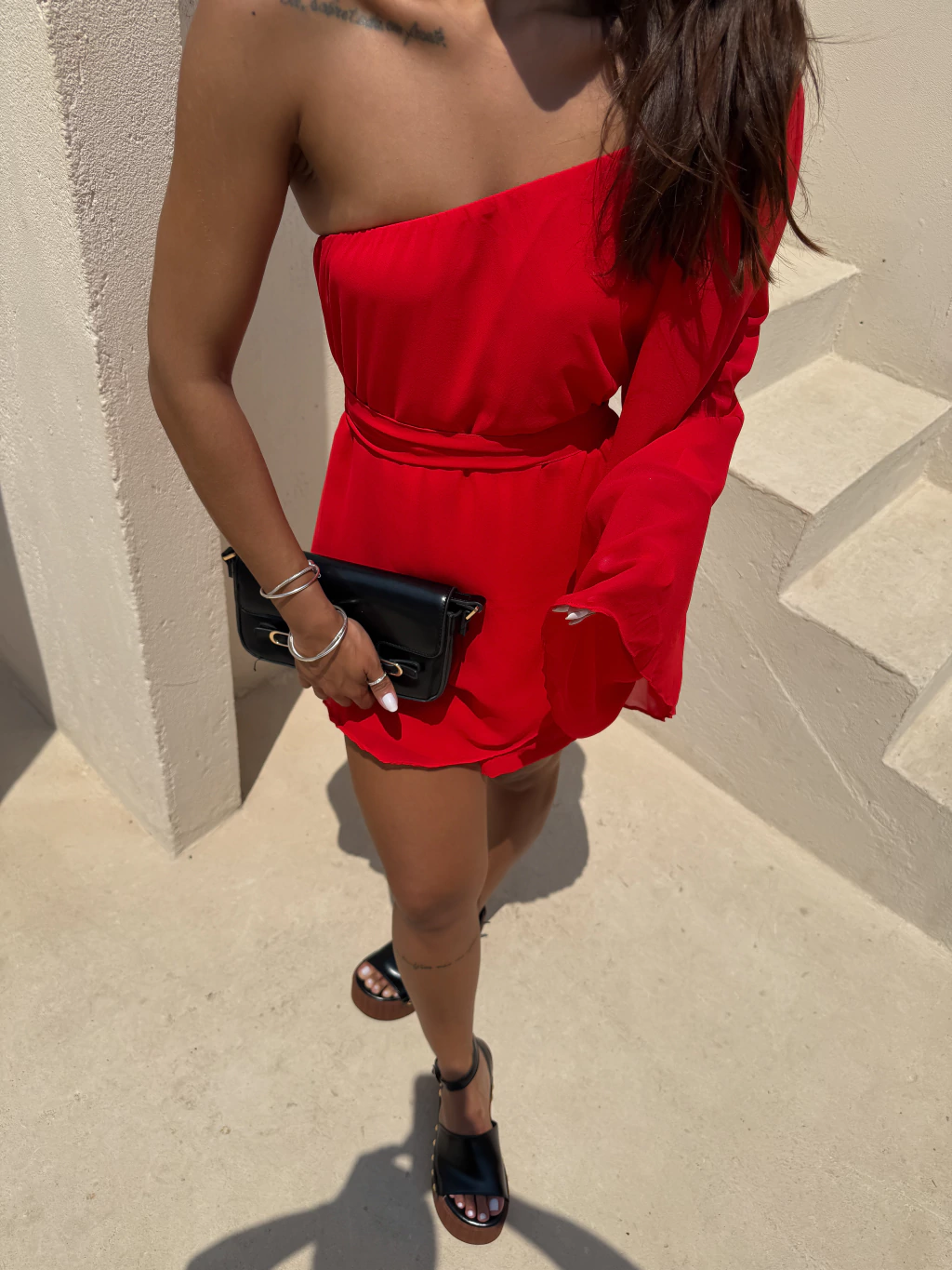 Macaquinho curto confeccionado em crepe chiffon, de uma manga só ampla. Possui elástico no busto e elástico na cintura da parte interna. Macaquinho lembra um vestido. Modelo fluído, leve e peça única, facil de fazer composições.